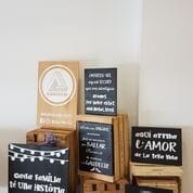 A estos murales con palabras o letras puedes añadirles algunas imágenes o fotografías vuestras que rompan con la tradición. Es decir, en lugar de colgar la típica foto de estudio en la que todos estáis sonriendo de forma un tanto forzada, ¿por qué no colgar aquella instantánea borrosa que os hicisteis en aquel viaje?, ¿o aquella otra foto en la que os estáis partiendo de risa? Colgar las imágenes de la vida real es mucho más personal y bello que aquellas otras fotos hechas para la ocasión. En este otro post te damos ideas para decorar tu casa con carteles de madera y que consigas un lugar moderno y original.